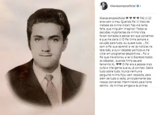 "PAI !!! 22 anos sem o meu Querido Pai !!! Mais de metade da minha Vida!!! Faz-me tanta falta, que ninguém imagina!! Todas as decisões importantes da minha Vida, foram tomadas a pensar em que conselhos é que me daria !!! O Pai tinha sempre a solução para tudo, ou quase tudo. .. Foi com o Pai que aprendi a ver as notícias na televisão, a ouvir debates políticos e me viciei em programas desportivos .. Foi o Pai que me ensinou a ler o Expresso todos os sábados , quando tinha aquele tamanho XL", começou por escrever.